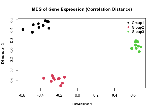 class: center, middle, inverse, title-slide .title[ # Multidimensional scaling (MDS) ] .subtitle[ ## Applications in Genomics ] .author[ ### Mikhail Dozmorov ] .institute[ ### Virginia Commonwealth University ] .date[ ### 2025-12-01 ] --- <!-- HTML style block --> <style> .large { font-size: 130%; } .small { font-size: 70%; } .tiny { font-size: 40%; } </style> ## What is Multidimensional Scaling (MDS)? - MDS aims to identify **latent variables** underlying inter-object similarity measures - **Reduce dimensionality** of data in a *non-linear* fashion - Reproduce **high-dimensional relationships** on a *lower-dimensional* display --- ## ## What is Multidimensional Scaling (MDS)? **Key Idea:** - Start with a **distance matrix** (not raw data) - Find coordinates in lower dimensions that best reproduce these distances - Similar objects appear close together, dissimilar objects far apart --- ## Multidimensional Scaling Types - **Classical MDS (cMDS):** Also called Principal Coordinates Analysis (PCoA) - **Metric MDS:** Preserves actual distance values - **Non-metric MDS:** Preserves only the rank order of distances --- ## MDS vs PCA vs SOM **Comparison:** | Method | Preserves | Interpretation | |:-------|:----------|:---------------| | **PCA** | Covariance of original data | Linear projection maximizing variance | | **SOM** | Topology (local neighborhood) | Nearby points represent similar items | | **MDS** | Metric (pairwise distances) | Maintains rank order of dissimilarities | --- ## MDS vs PCA vs SOM **Similarities:** - Both PCA and MDS are dimensionality reduction techniques - Both can be used for visualization - Classical MDS and PCA give identical results on Euclidean distances **Key difference:** MDS is **non-linear** dimensionality reduction, while PCA is linear --- ## When to Use MDS? **Use MDS when:** - You have a distance/dissimilarity matrix but not raw data - Working with non-Euclidean distances (e.g., genetic distances, sequence alignments) - Distance relationships are more meaningful than variance - Need to visualize phylogenetic relationships - Comparing complex objects (text, images, proteins) **Genomics applications:** - Population structure analysis with genetic distances - Comparing gene expression profiles with correlation distances - Microbiome community composition - Protein structure comparisons --- ## Classical MDS: The Math Given a **distance matrix** `\(D\)` with elements `\(d_{ij}\)` (distance between objects `\(i\)` and `\(j\)`): 1. **Create squared distance matrix:** `\(D^{(2)}\)` with elements `\(d_{ij}^2\)` 2. **Double centering:** Apply centering transformation `\(B = -\frac{1}{2}HD^{(2)}H\)` where `\(H = I - \frac{1}{n}\mathbf{1}\mathbf{1}^T\)` (centering matrix) 3. **Eigendecomposition:** Solve `\(B = V\Lambda V^T\)` 4. **Coordinates:** First `\(k\)` dimensions given by `\(X = V_k\Lambda_k^{1/2}\)` **Result:** Classical MDS with Euclidean distances = PCA on original data --- ## MDS Basic Algorithm **Iterative procedure for metric/non-metric MDS:** 1. Obtain and order the `\(M\)` pairs of similarities 2. Choose a configuration in `\(q\)` dimensions - Compute inter-item distances and reference numbers - Minimize **Kruskal's stress** 3. Move points to improve configuration 4. Repeat until **minimum stress** is achieved This is the general algorithm used by functions like `isoMDS()` --- ## Example 1: US Cities Classic MDS example - reconstruct city locations from distances ``` r # Built-in dataset: road distances between US cities data(UScitiesD) UScitiesD # Perform classical MDS (2 dimensions) mds_cities <- cmdscale(UScitiesD, k = 2) # Plot the result plot(mds_cities[, 1], mds_cities[, 2], type = "n", xlab = "Coordinate 1", ylab = "Coordinate 2", main = "MDS of US Cities") text(mds_cities[, 1], mds_cities[, 2], labels = rownames(mds_cities), cex = 0.8) ``` **Note:** Cities arranged approximately in their geographic locations! --- ## Example 1: Output <img src="MDS_files/figure-html/unnamed-chunk-2-1.png" style="display: block; margin: auto;" /> MDS reconstructs approximate geographic positions from distances alone! --- ## Example 2: Iris Data Compare MDS with PCA on the classic iris dataset ``` r # Load iris data data(iris) iris_data <- iris[, 1:4] # Just the measurements # Compute Euclidean distance matrix iris_dist <- dist(iris_data, method = "euclidean") # Perform classical MDS mds_iris <- cmdscale(iris_dist, k = 2) # For comparison: PCA pca_iris <- prcomp(iris_data, center = TRUE, scale. = FALSE) ``` --- ## Example 2: MDS vs PCA Plots ``` r par(mfrow = c(1, 2)) # MDS plot plot(mds_iris[, 1], mds_iris[, 2], col = iris$Species, pch = 19, xlab = "Dimension 1", ylab = "Dimension 2", main = "Classical MDS") legend("topright", legend = levels(iris$Species), col = 1:3, pch = 19, cex = 0.7) # PCA plot plot(pca_iris$x[, 1], pca_iris$x[, 2], col = iris$Species, pch = 19, xlab = "PC1", ylab = "PC2", main = "PCA") ``` <img src="MDS_files/figure-html/unnamed-chunk-4-1.png" style="display: block; margin: auto;" /> **Result:** Nearly identical! (Classical MDS = PCA for Euclidean distances) --- ## Example 3: Gene Expression Data Using correlation-based distance for gene expression ``` r # Simulate gene expression data set.seed(123) n_samples <- 30 n_genes <- 100 # Create data with 3 groups expr_data <- matrix(rnorm(n_samples * n_genes), nrow = n_samples, ncol = n_genes) # Add group structure expr_data[1:10, 1:30] <- expr_data[1:10, 1:30] + 2 expr_data[11:20, 31:60] <- expr_data[11:20, 31:60] + 2 expr_data[21:30, 61:90] <- expr_data[21:30, 61:90] + 2 groups <- rep(c("Group1", "Group2", "Group3"), each = 10) ``` --- ## Example 3: Computing Distance ``` r # Correlation-based distance # Distance = 1 - correlation cor_matrix <- cor(t(expr_data)) cor_dist <- as.dist(1 - cor_matrix) # Perform MDS mds_expr <- cmdscale(cor_dist, k = 2) # Plot plot(mds_expr[, 1], mds_expr[, 2], col = as.factor(groups), pch = 19, cex = 1.5, xlab = "Dimension 1", ylab = "Dimension 2", main = "MDS of Ge